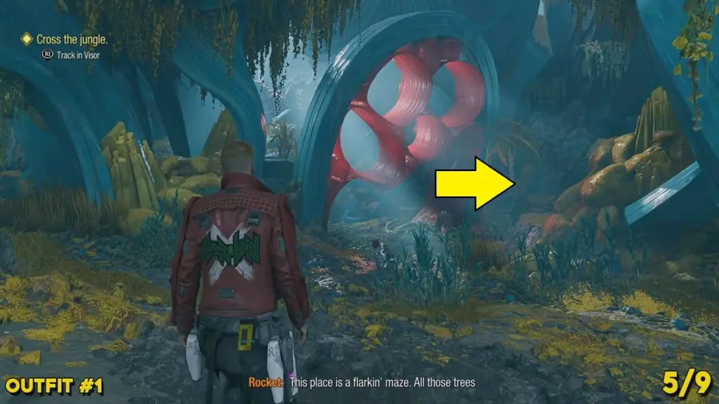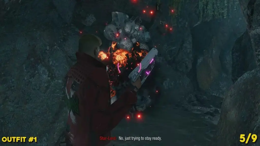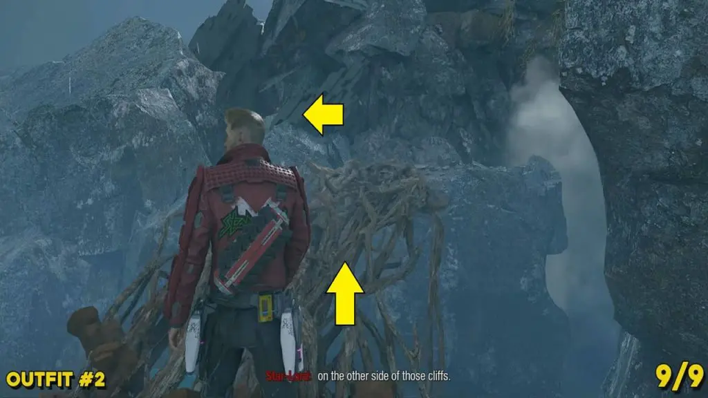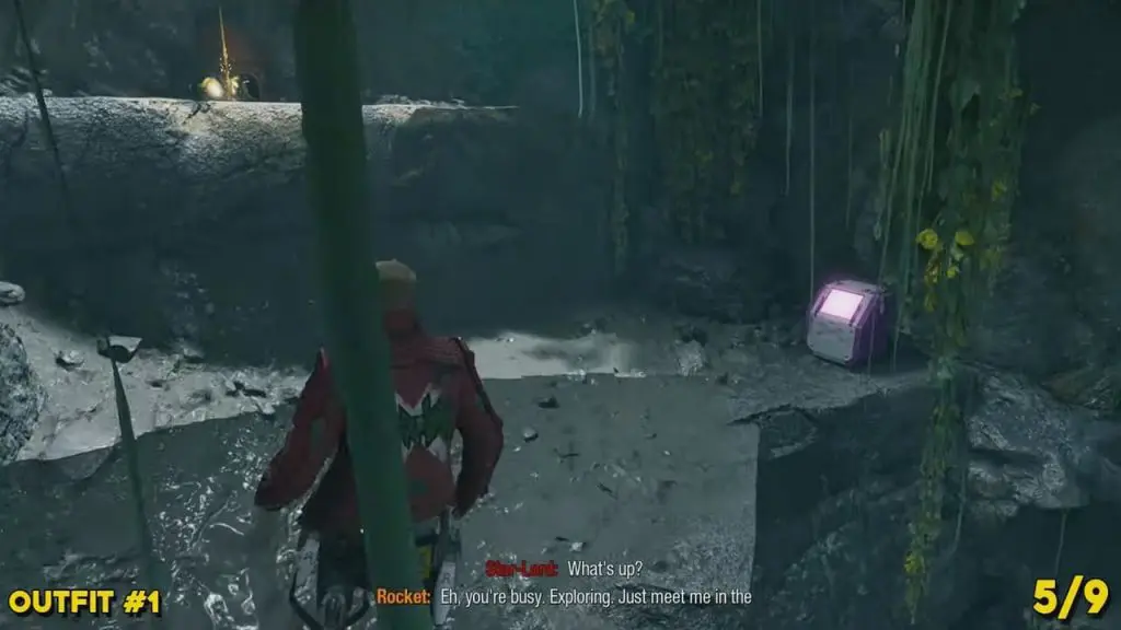 This is available after defeating the two big Slakebeasts. A player has to command Groot to build a bridge to cross the gap and reach the waterfalls. After going over Groot’s bridge, head left and destroy the grey goo. Continue to follow the path inside the cave until you reach a waterfall. Use Ice Element blasters to freeze the waterfall in the cave and jump up to the other side to find the outfit.