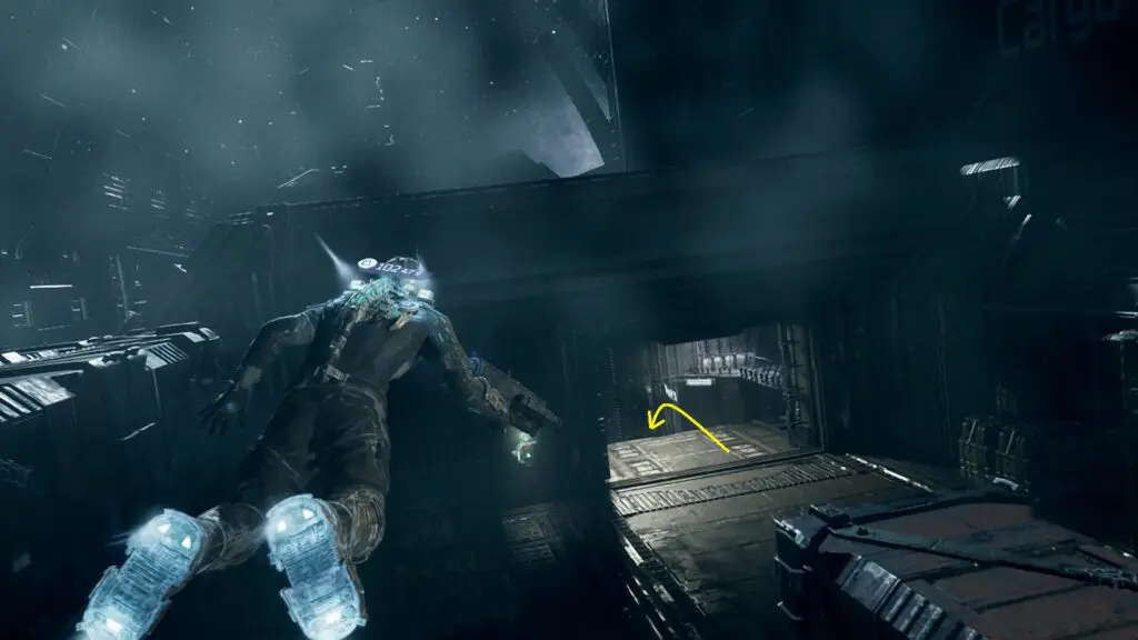 As the mission starts keep going straight on the hangar bay. Your path will be blocked, so you will need to use your thrusters to fly across. On the right side, you will find an entrance as shown in the picture below. Go inside and jump down using the thrusters. Reach the lowest level, where you will find the door leading to the Engineering Bay as shown in the second picture below. Go inside and continue on the straight path to reach the destination.