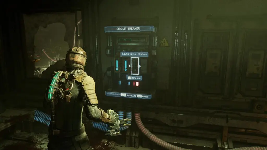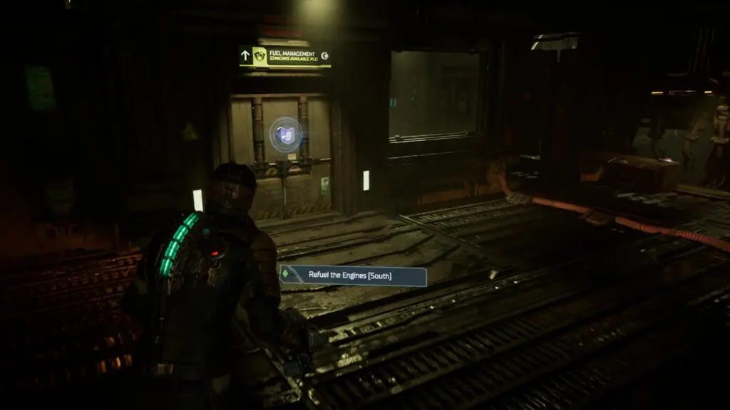 Go back down the ramp and use the Keycard to enter the Fuel Management room as shown in the picture below. Use the circuit breaker inside to power the South Refuel Station as shown in the second picture below.