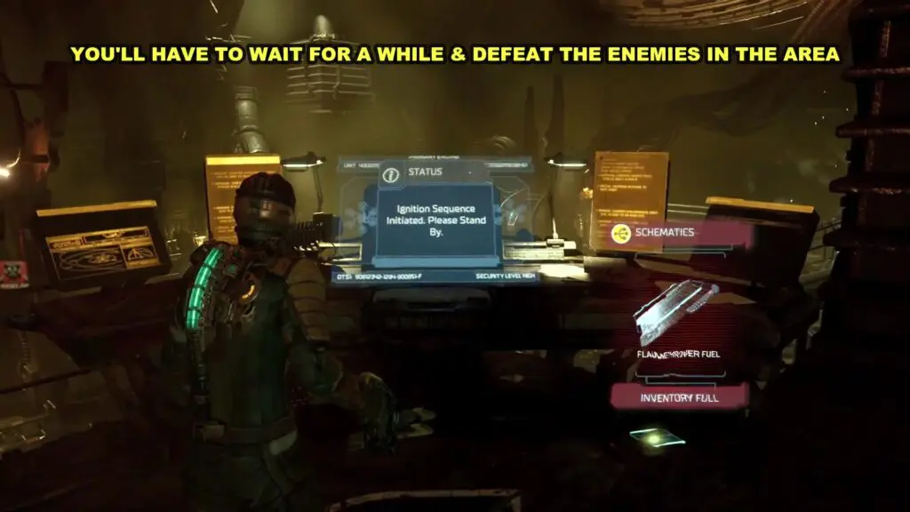 Defeat the enemies and go to the console on the platform above as shown in the picture below. When the engines are ready, confirm ignition on the console. This will complete the objective.