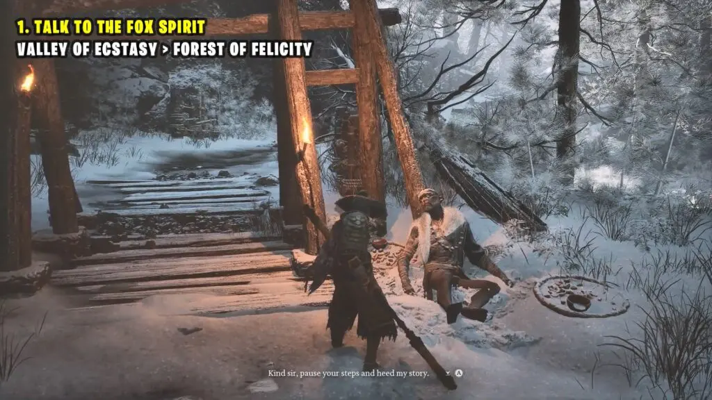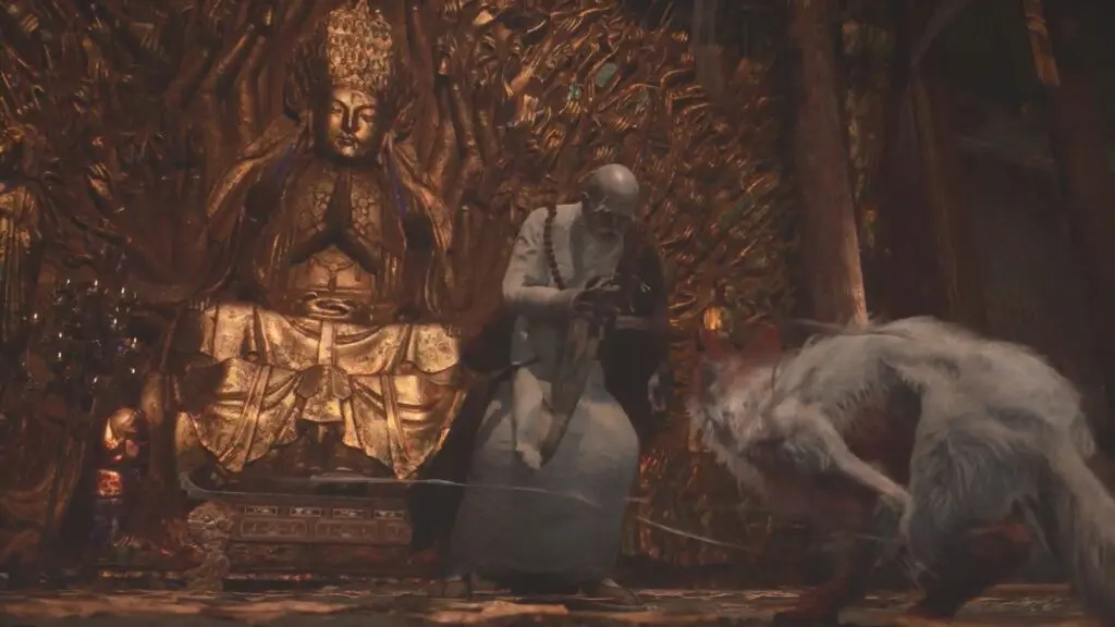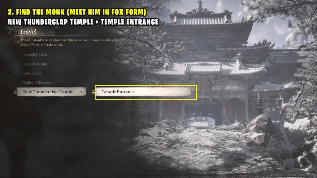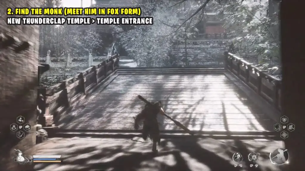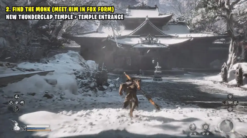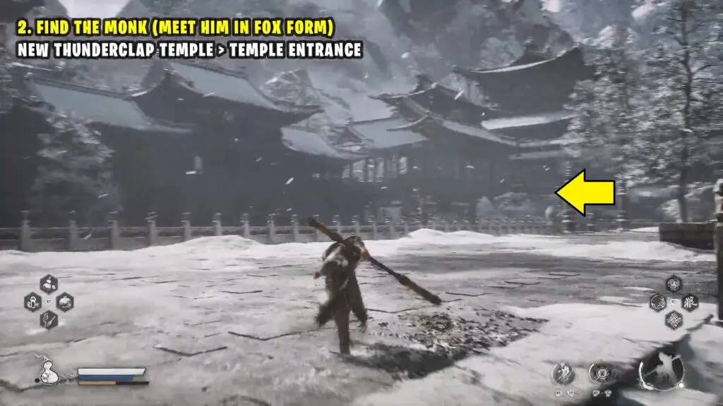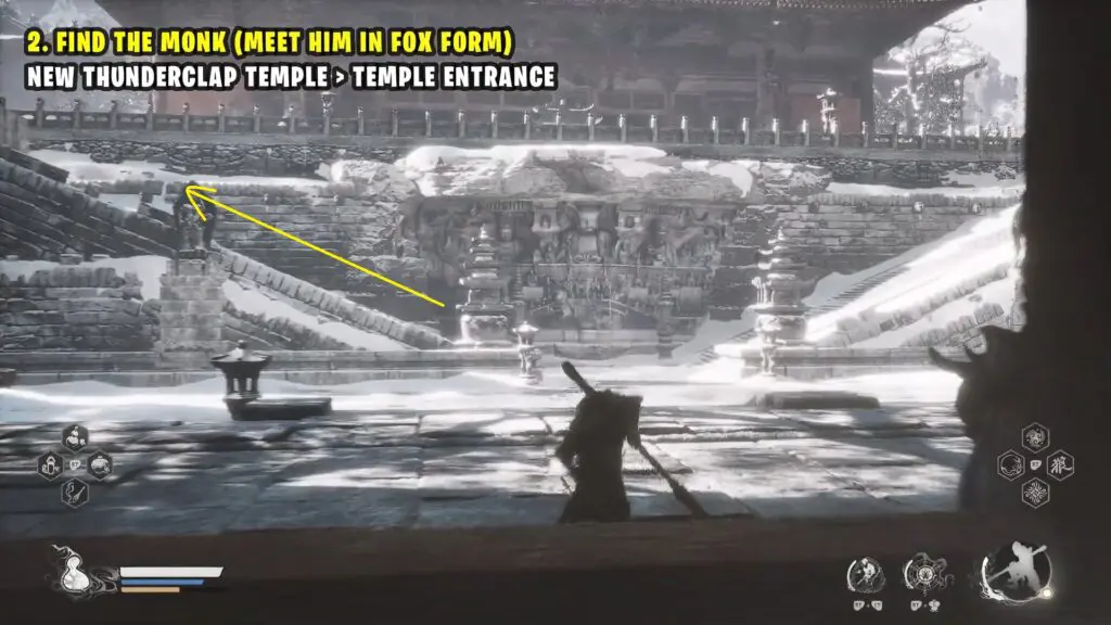 Before you enter the temple, open your inventory and use the ‘Snow Fox Brush’ to turn into a fox. When you enter the temple as a fox, a cutscene with the monk will start.