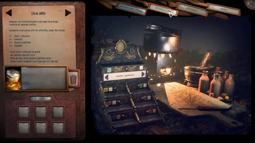 To prepare the ‘Calm Mind’ Potion you’ll need the following herbs: 1 Devil’s Eyelashes, 1 Liquorice, 2 Bachelor Buttons & 1 Henbane. You’ll find these herbs in the garden at the back side of the chapel.