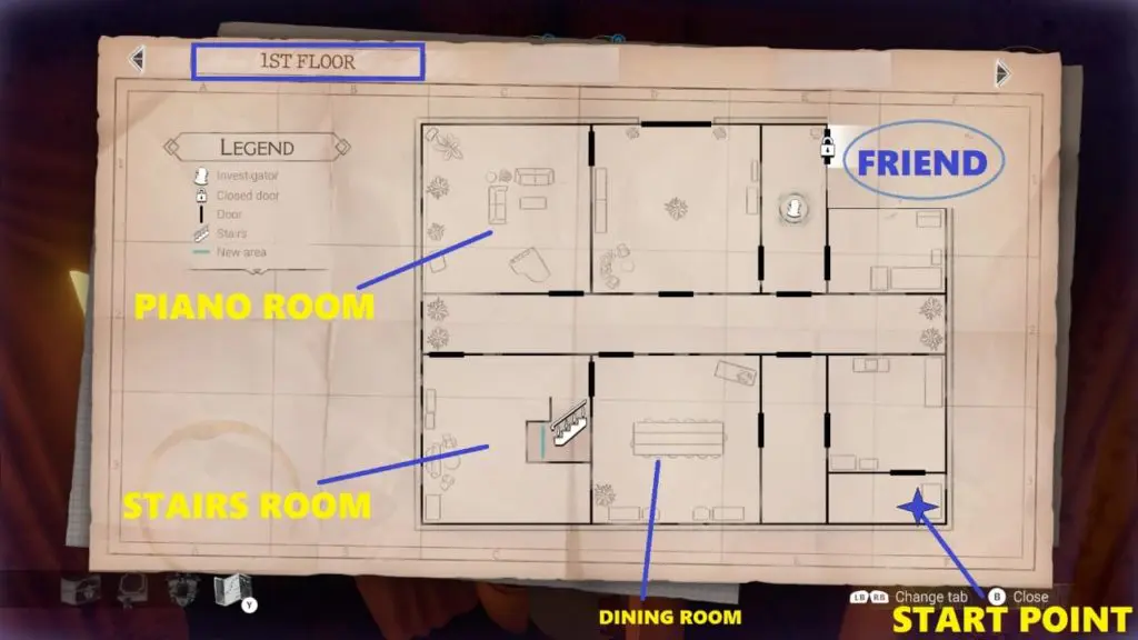 • Find where your partner is held: The partner is locked in a servent’s bedroom on the first floor, and the key is in the living room of the second floor. Once you find the key, approach the locked door to free your partner.
