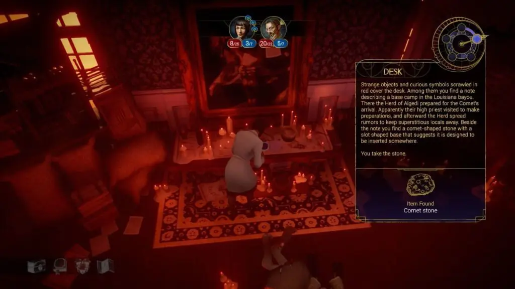 • Investigate the strange ritual room: Interact with the item on the desk in front of the big painting. You will get a comet stone here.