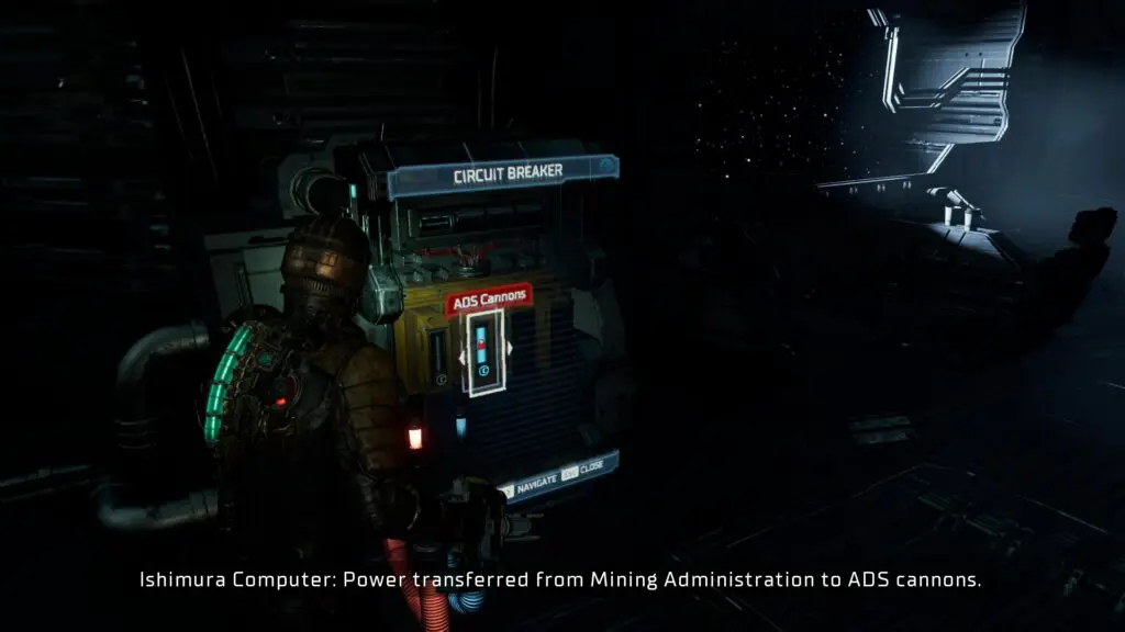 Hop off the elevator and go left to find the Circuit Breaker as shown in the picture below. Use the Circuit Breaker to power the ADS Cannons. This will complete the Power and Restart the ADS Cannons.