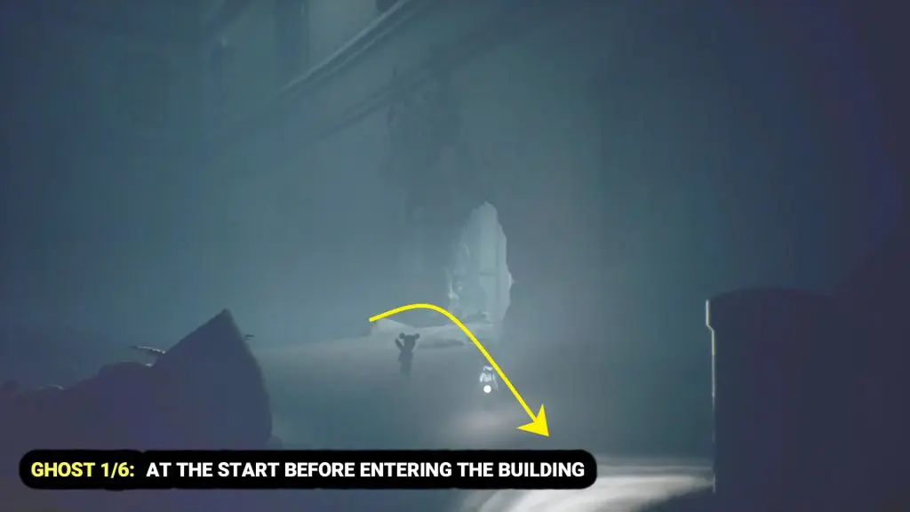 At the start of the chapter, walk toward the building, but don’t go inside. From the entrance, go toward the right and pass a small staircase. Behind it, you’ll find the first ghost by the wall.