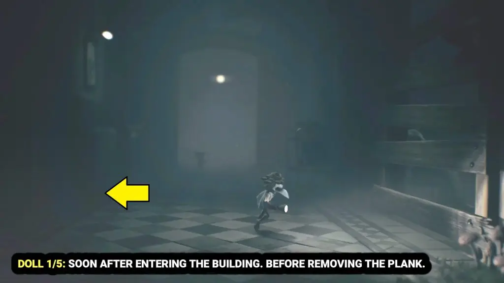 After entering the building, you’ll see a wooden plank that you need to pull down. Instead of doing that, go through the door on the left and into the second room to find the doll on the floor.