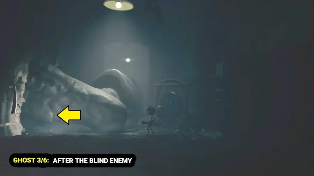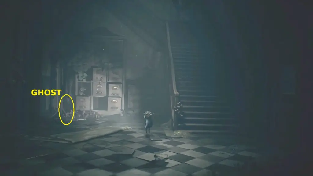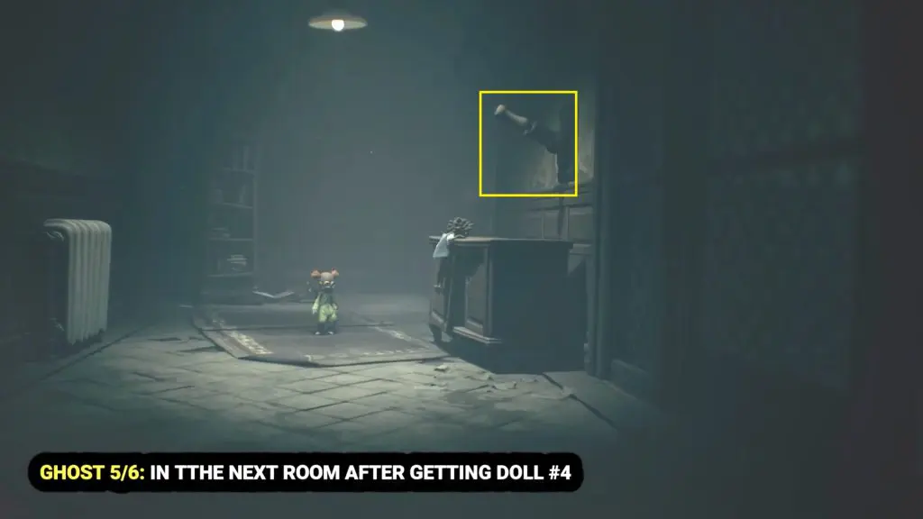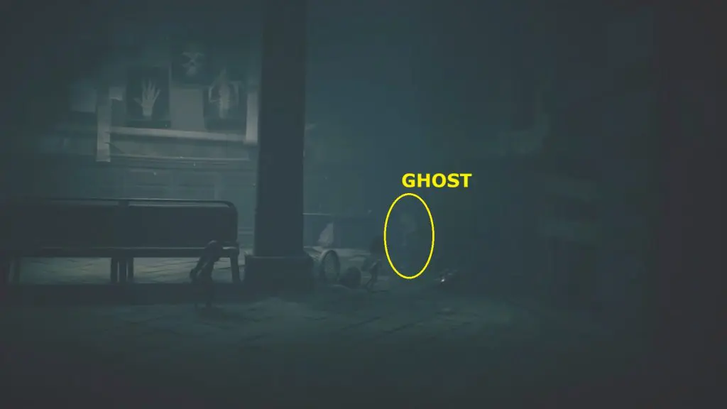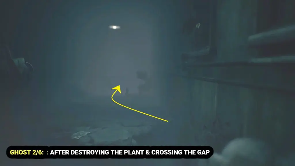 Keep following the main story and go through the gap. After crossing it, you’ll find the ghost in the back-right corner of the hallway, near a bin.