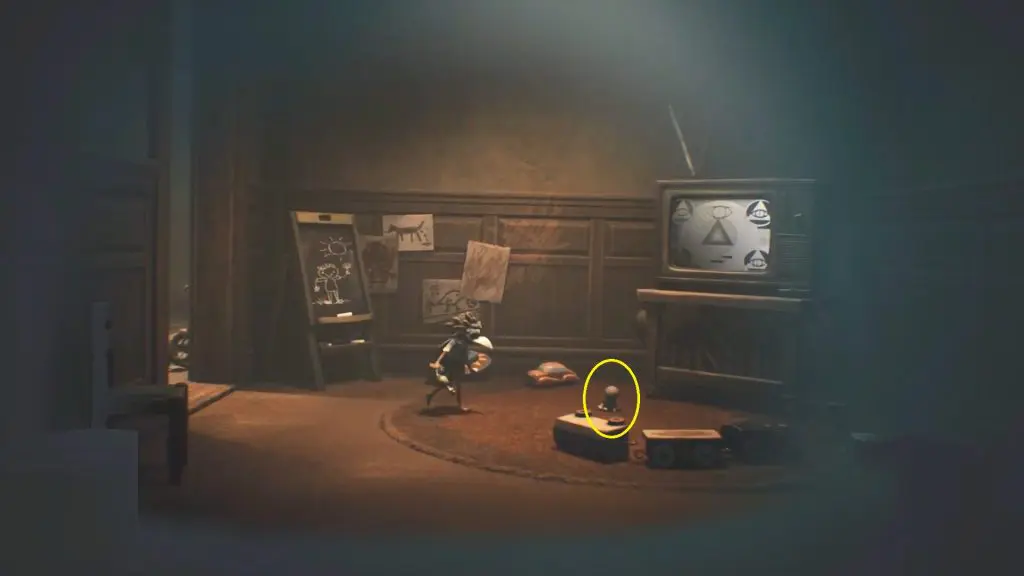 After being chased a second time by the boss’s hand, you’ll reach a door that needs to be opened by pulling a lever. Before doing that, head to the back of the hallway and pick up the doll.