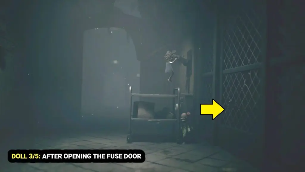 As soon as you unlock the door with a fuse, roll the trolley into the room and climb the machine. The doll is on the top.