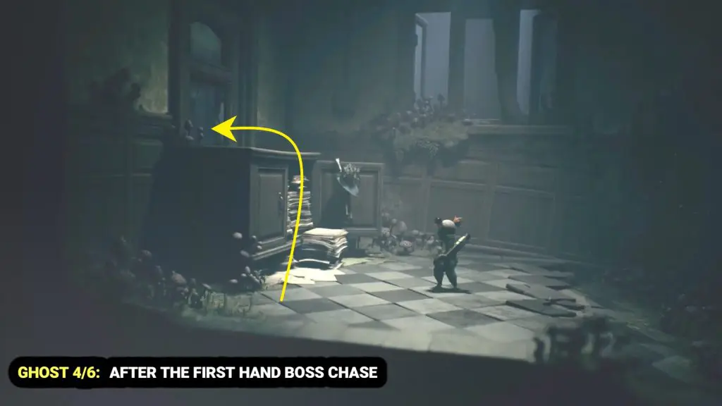 After being chased by the boss’s hand, go through the window on the upper-left corner of the room to find the ghost hiding there.