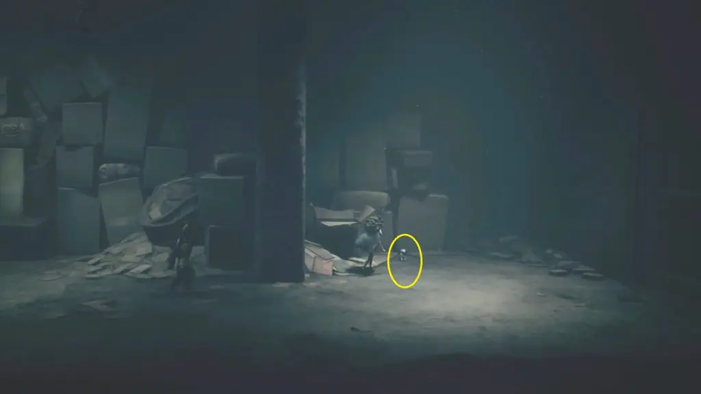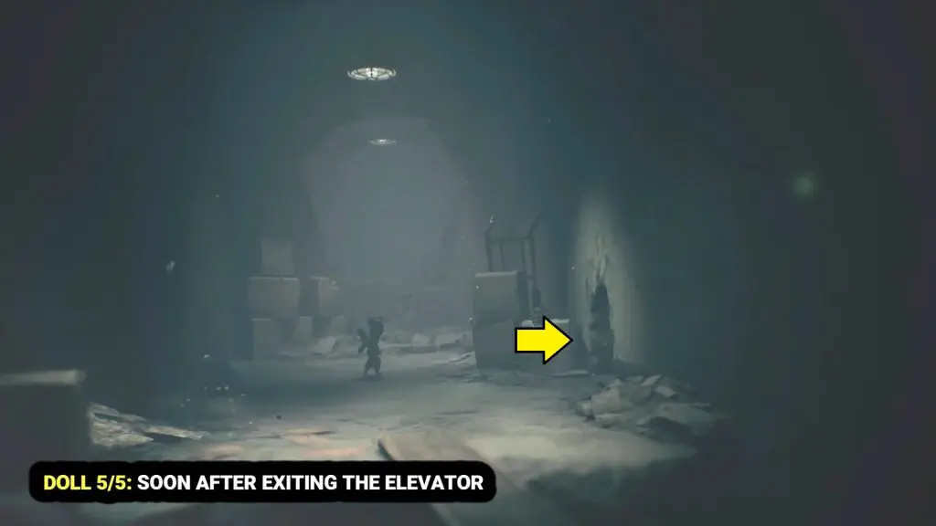 After exiting the elevator, go to the right, where you’ll see some boxes and an opening on the right. Go through the opening and pick up the final doll in the second room.