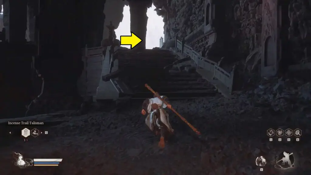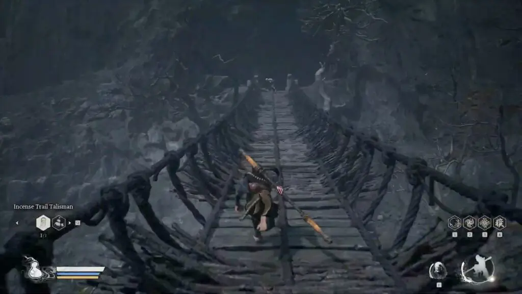 After entering the cave, go down the slope on the left side when you exit. Cross the wooden bridge, continue straight, and follow the stairs.