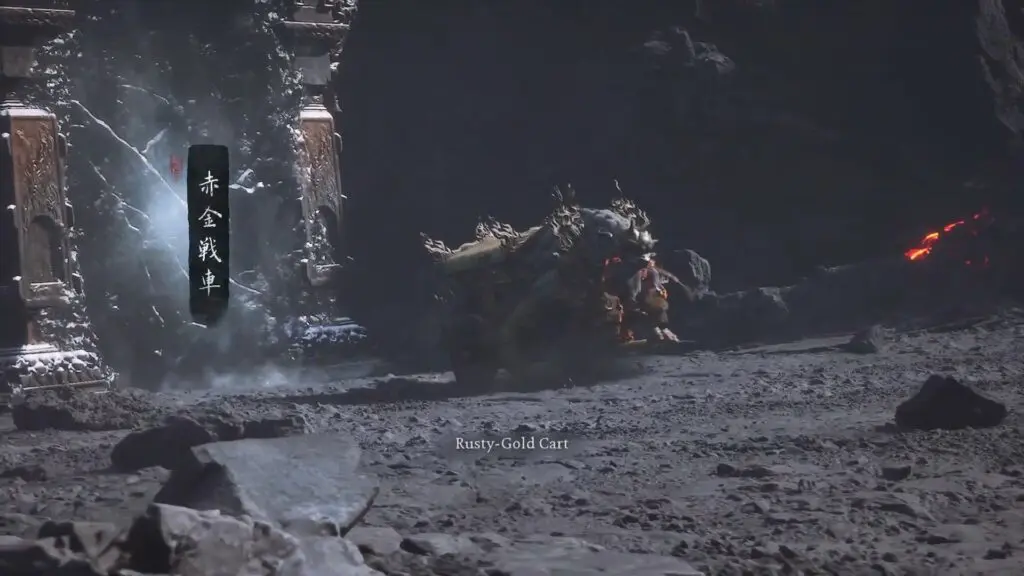 Go to the right side of the shrine and enter the lava cave to find this cart. You don’t have to fight; pull the rope hanging from its face 3-4 times. This part is linked to the Horse Guai Quest Guide