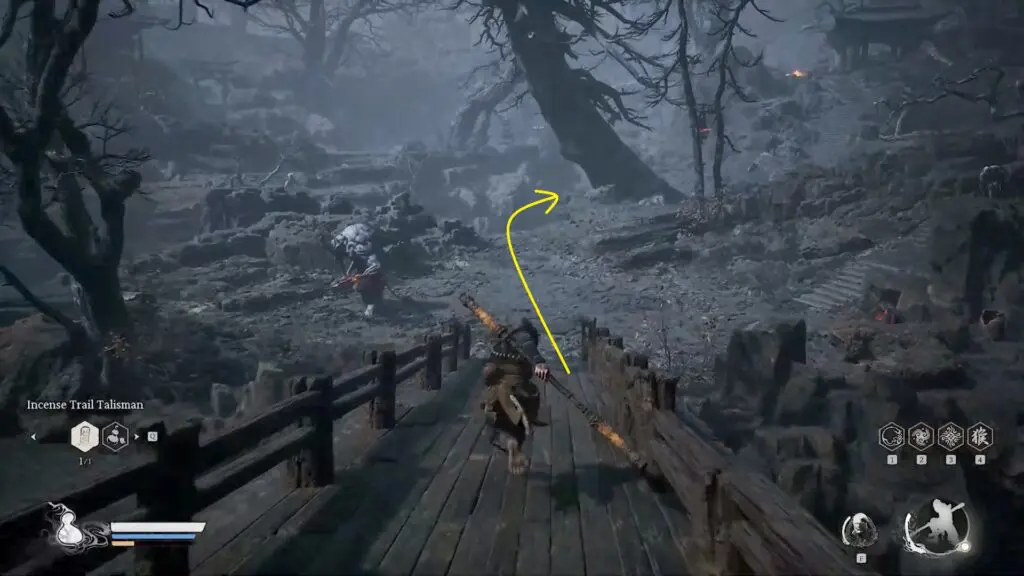 Follow the path behind the previous boss, take a left at the shrine (Camp of Seasons), and cross the rope bridge.