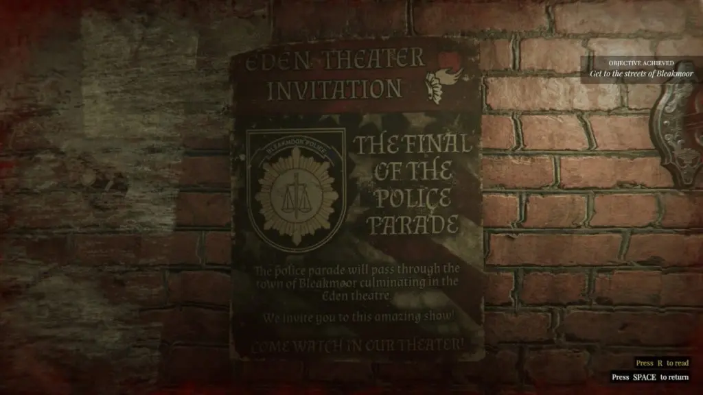 Once this chapter start, collect the knife lying on the ground near the dead body. Exit through the door and read the flyer posted on the wall about “Eden Theater Invitation”.
