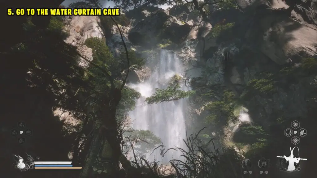 Go inside the waterfall and follow the path until you trigger a cutscene. After the cutscene, you’ll receive a staff.