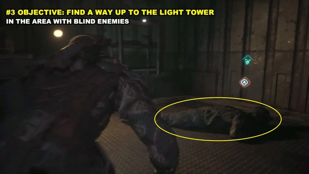 Climb up two sets of stairs after the elevator. You will find a corpse inside a room on the right side. Just before the signboard of “Bathroom” and “Roof Top”.