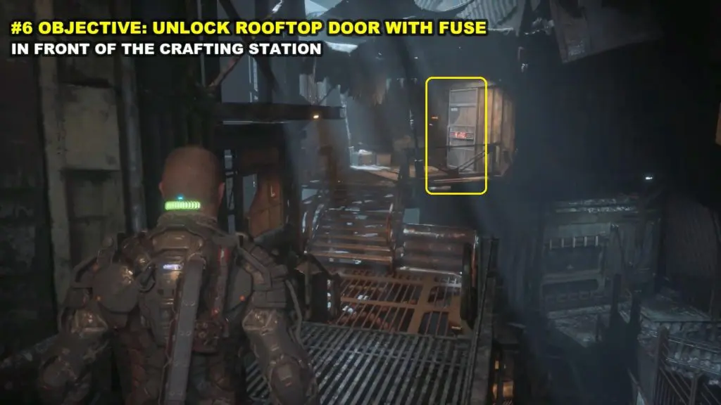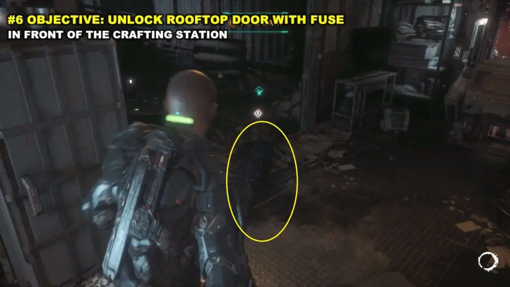 Go to the rooftop and use the Gate Fuse to open the door. You will find a corpse inside in front of the crafting station.