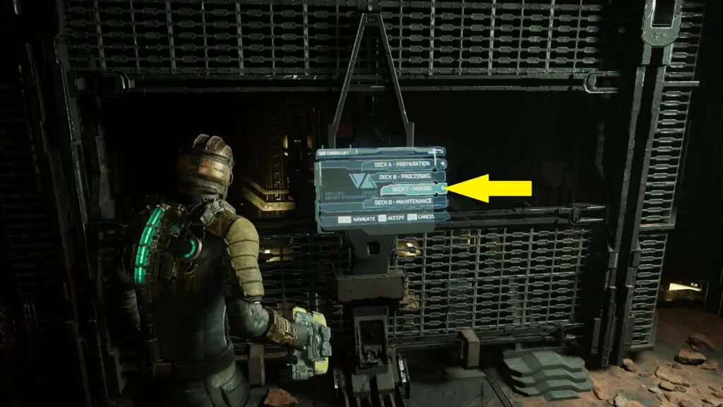 As you get the objective, proceed ahead and enter the Rig Room. Then go straight ahead and enter the Elevator to Mining Operations. Take the elevator to Deck C- Mining as shown in the picture below.