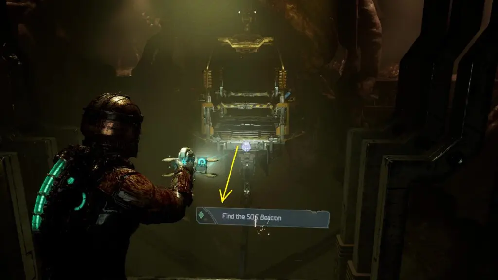 From the Mineral processing Control room, take the elevator going towards the elevator. Make your way back to the Elevator to Mining Operations. Take the elevator to Deck D- Maintenance. Step out of the elevator and go to the Equipment Maintenance Bay. There you will find a cable car. Use Kinesis to pull it towards you as shown in the picture below. Then ride it to the other side. Step out of the cable car and enter the Repair Room. Then defeat all the enemies and enter the Equipment Workshop. Go down the stairs there to find the SOS Beacon.
