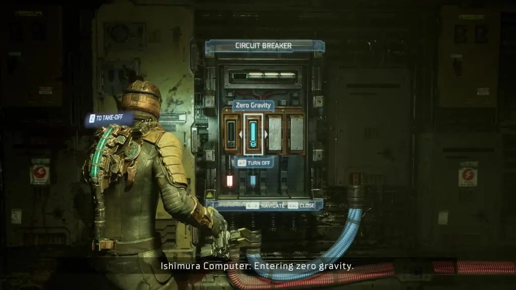 After collecting the SOS Beacon, use the elevator in the same room to go to the upper floor. Hop off the elevator and go right to Equipment Maintenance Bay. There you will find a Circuit Breaker. Use it to switch on Zero Gravity as shown in the picture below.