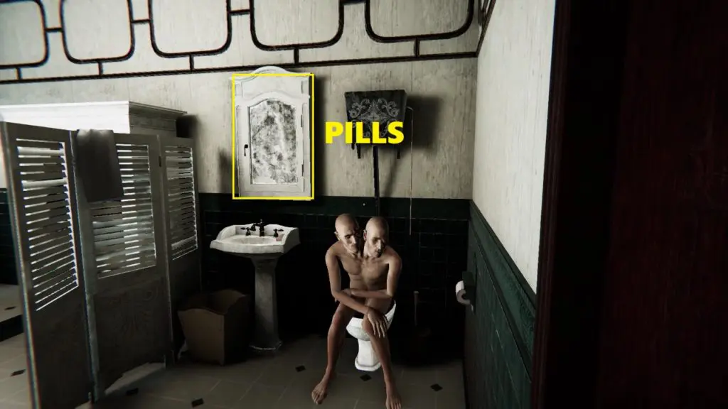 Collect the pills from the bathroom, located on the second floor. Pills are in the cupboard above the sink. Go downstairs (first floor) and give pills to the suffering man sitting in the living room.