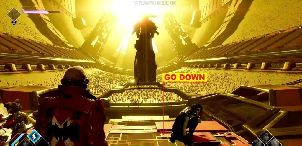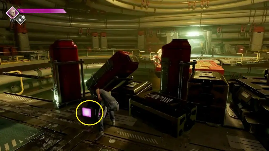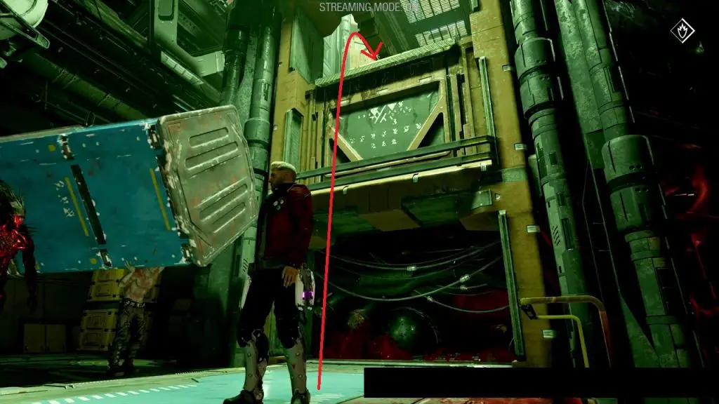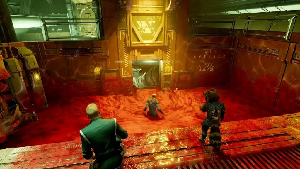 In the chapter, you will come across red Fluid as shown below. Jump into the red fluid and go to the next area. Here, command Drax to move a pillar in front of the tunnel exit where you just came from. Then climb the pillar to reach the upper level, where you will find the outfit.