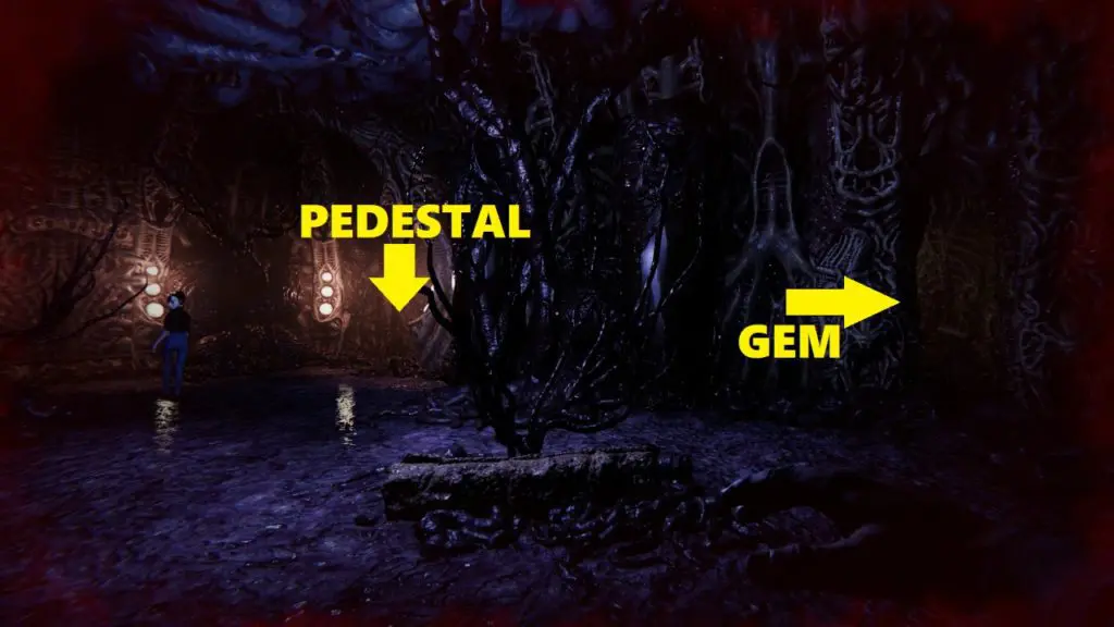 Find the gem and place it over the pedestal to open up a path. The gem is inside a giant leaf.