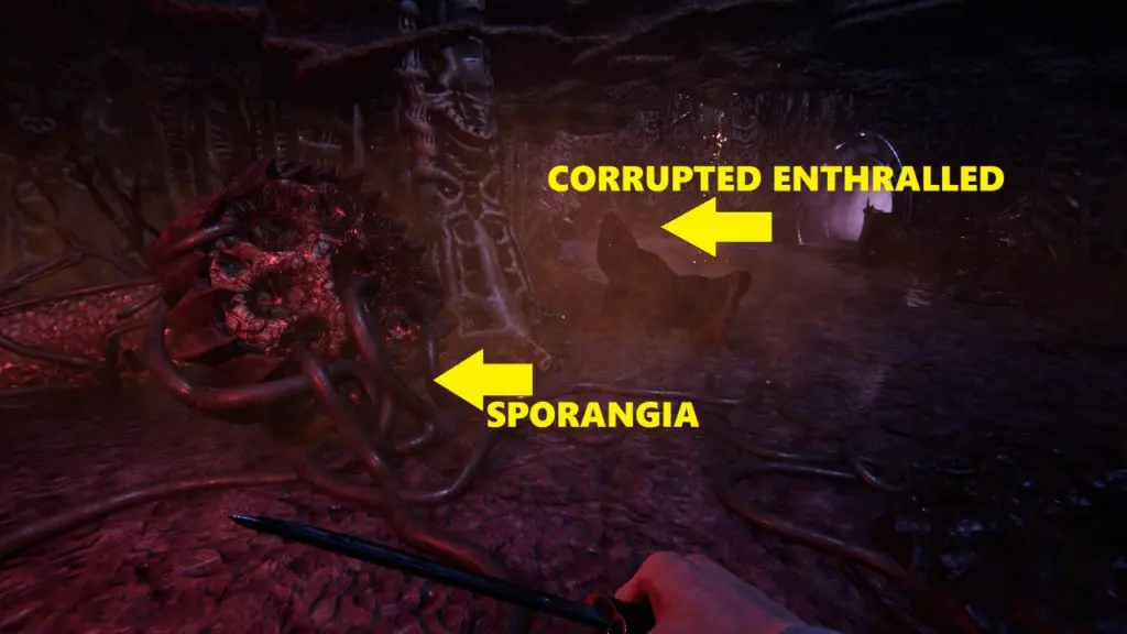 Collect the Essence to make the corrupted Enthralled to follow you. Use a knife to kill a corrupted Enthralled in front of the Sporangia. The Sporangia will then feed the Enthralled making the tumor grow and complete the bridge.