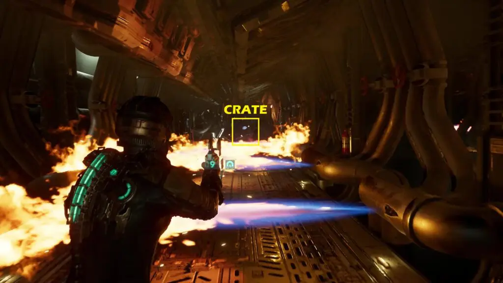 As you enter the Engine Room, you will see an unpowered elevator on the right side. Go to the left side of the room, which is filled with fire hazards. The first few fires will stop for a second. Proceed ahead when the fire stops. When you reach the fire that doesn’t stop, use kinesis to pull the crate ahead of you as shown in the picture below, and use it to block the fire. Now go right.
