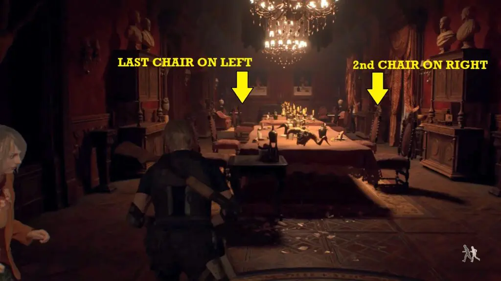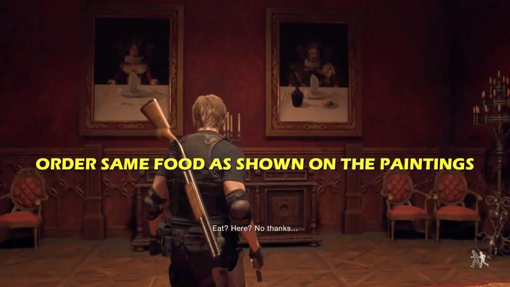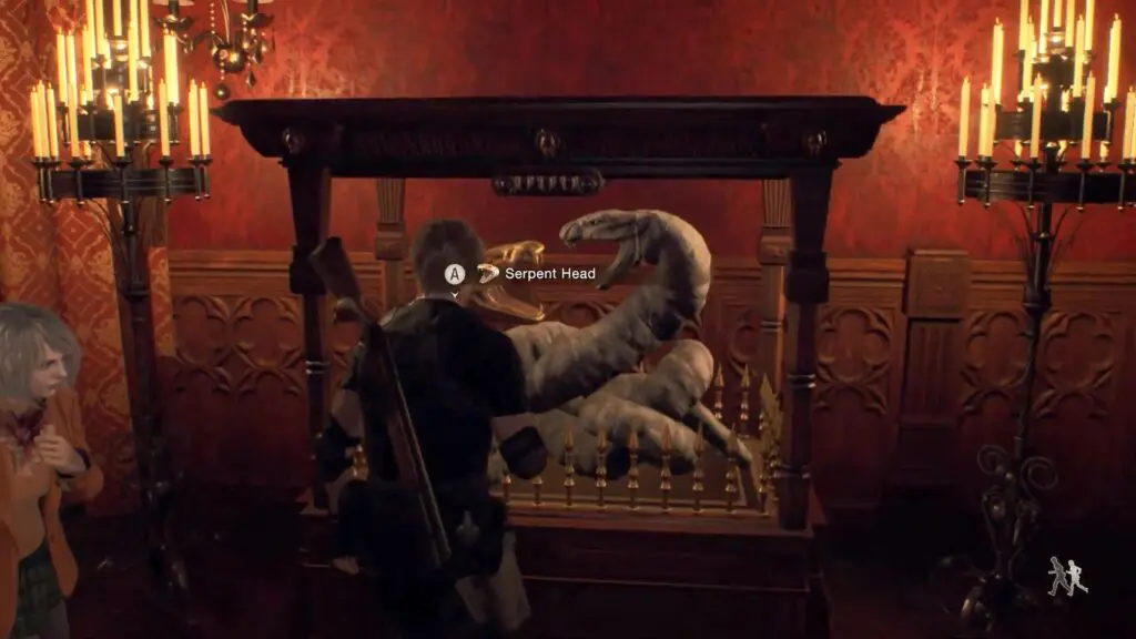 After arriving in the dining hall, a puzzle must be solved to retrieve the Serpent Head from its cage. To achieve this, both you and Ashley must take a seat at the tables depicted in the portraits of the king and queen and ring the bell.