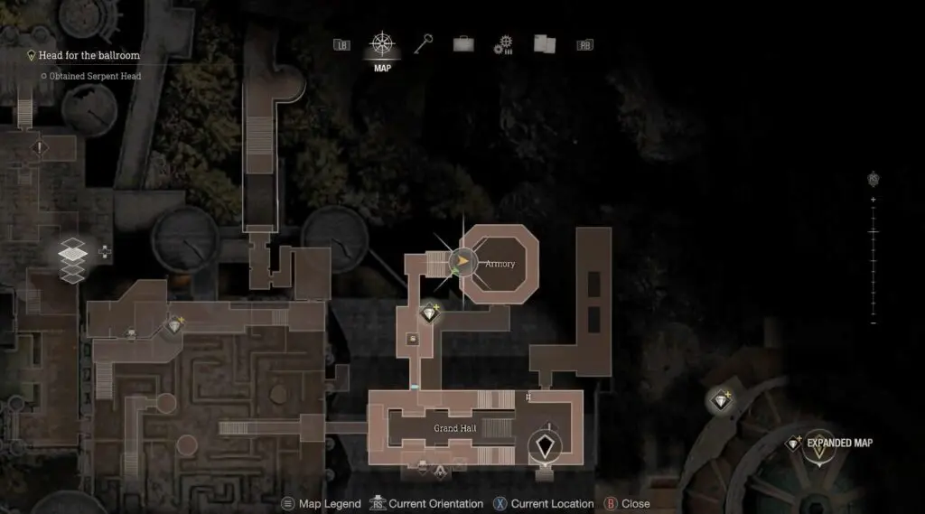 Return to the Grand Hall and go up the stairs to the upper level. Proceed into the room on the right to enter the Armory.