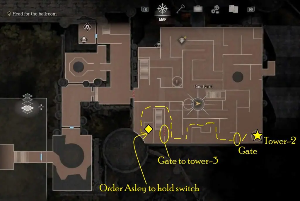 This will enable you to ascend to the upper level and reach the ultimate destination, Tower-3. Once all three levers have been pulled to lower the flags, the entrance to the Grand Hall will be unlocked. Drop down and quickly run back to Ashley, as most of these enemies are rushing over to try and grab her. Finally, depart through the eastern path to enter the Grand Hall.