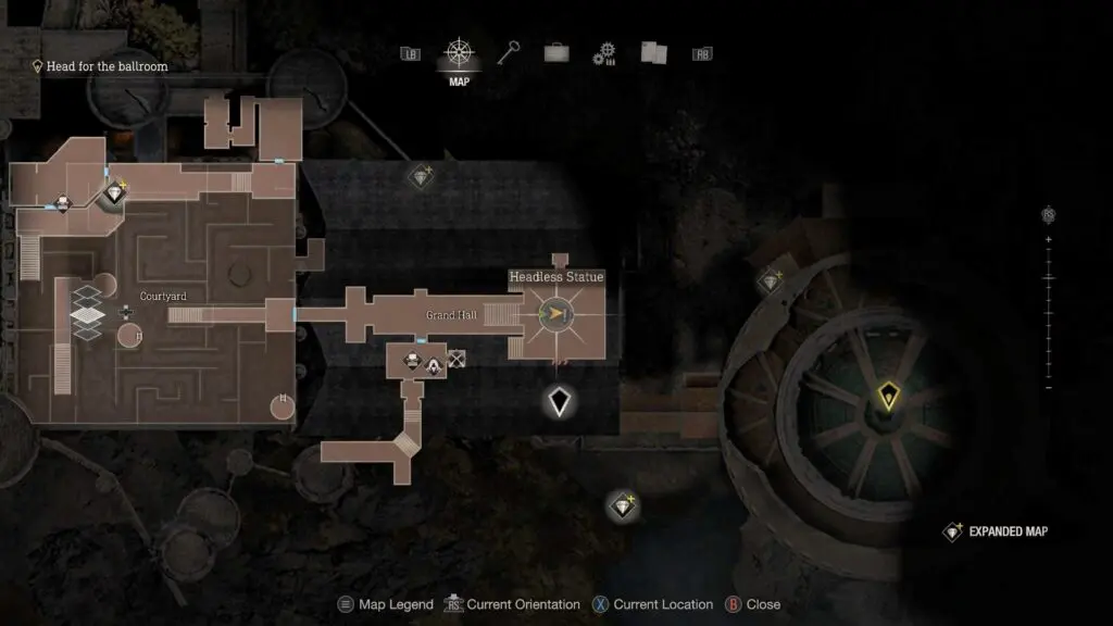 Keep moving to the east in the Grand Hall until you arrive at the Headless Statue. From there, pass through the left-hand doorway to enter the dining hall.