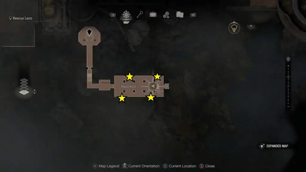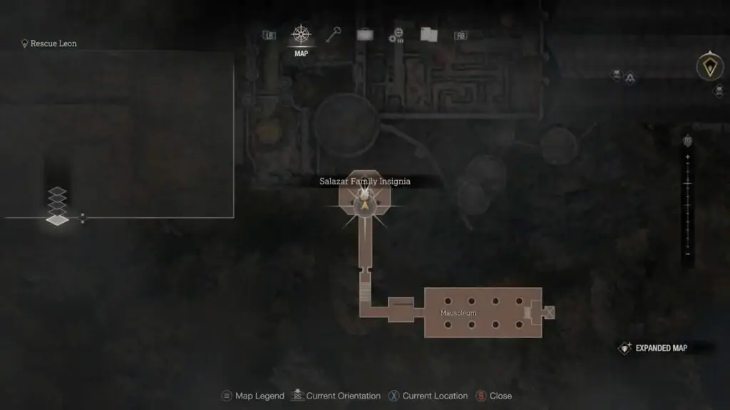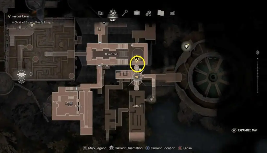 Retrace your steps to where you last encountered Leon, and continue to run towards the Mausoleum. From there, make your way back to the library and ascend to the upper level using the elevator (or the stairs on the eastern side of the library)