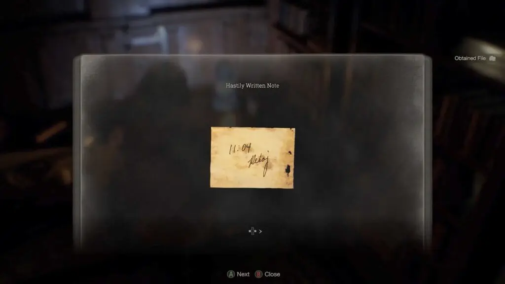 After reaching the upper part of the library and having a brief conversation with Leon, proceed to the back of the room and inspect the note on the table.