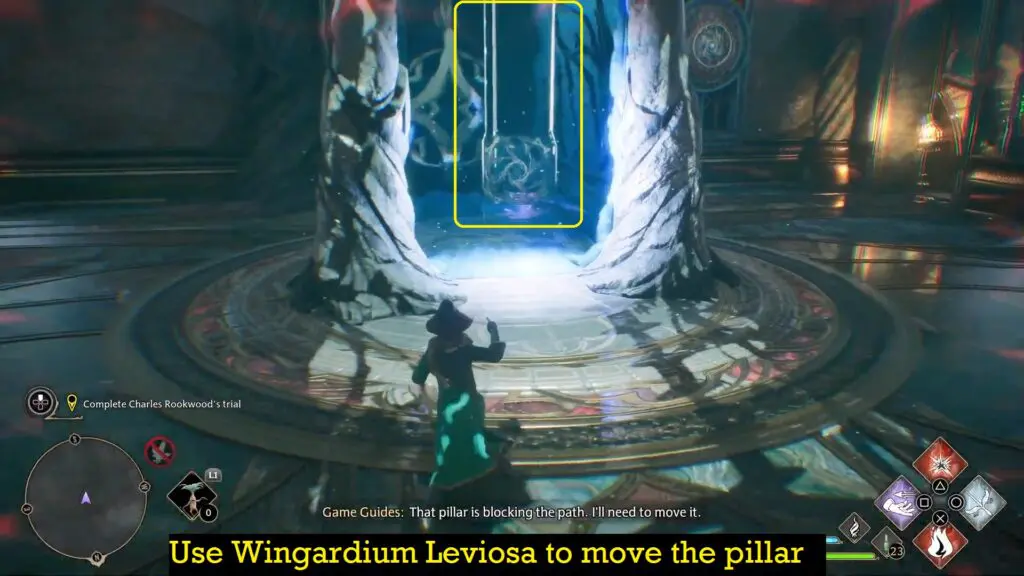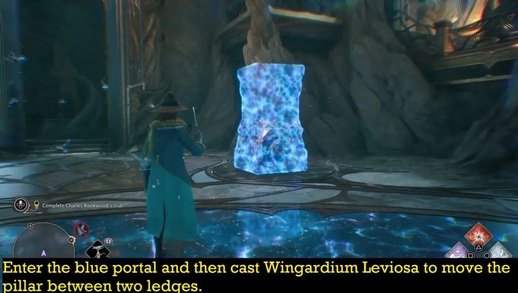 Enter the portal ( or stay outside) and use Wingardium Leviosa to move the pillar blocking the path. (Use Wingardium Leviosa or Accio on the pillar to move it and clear the path.)