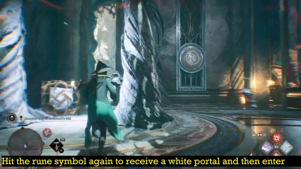 Now go back down the stairs. Enter the blue portal and cast Wingardium Leviosa on the silhouette pillar on the right and set it halfway between the Ancient Magic location and the side you want to go next.