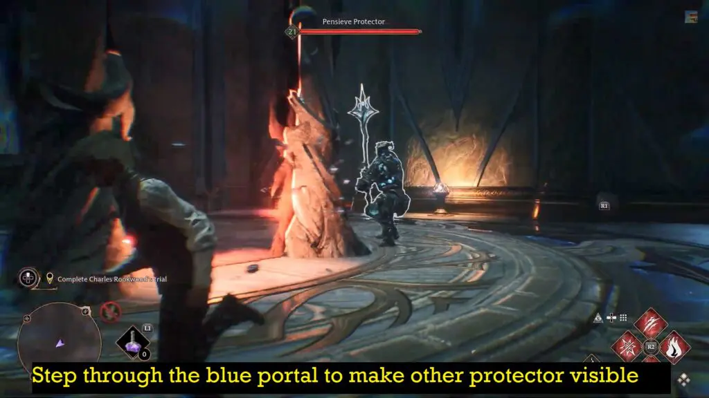 Go down the platform into the portal area. Here you will need to defeat two Protectors.