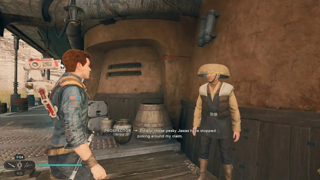 This guide shows how to complete the Check on the Jawa Settlement Rumor in the Star Wars Jedi: Survivor game, released on 28th April 2023. The quest starts by talking to the Prospector in Rambler’s Reach Outpost at the location shown in the pictures below.