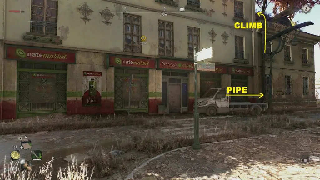 Here, you will see Natemarket. Next to the shop, you will see a pipe going up on the wall as shown in the picture below. Use the pipe to climb up the wall and then continue ahead to reach the roof.