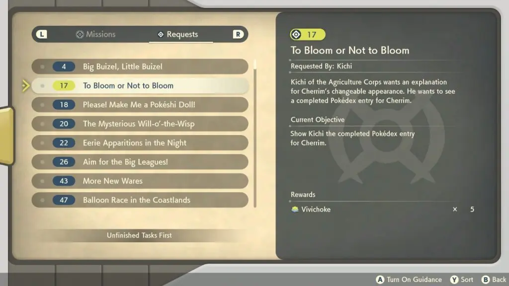This guide shows the complete walkthrough of “Request 17: To Bloom or Not to Bloom” in Pokemon Legends Arceus. For this request, you will need to add Cherrim to your Pokedex. You will get this quest by talking to Kichi in Jubilife Village Farm. The quest will be available only after you have completed “A Request from Mai mission.