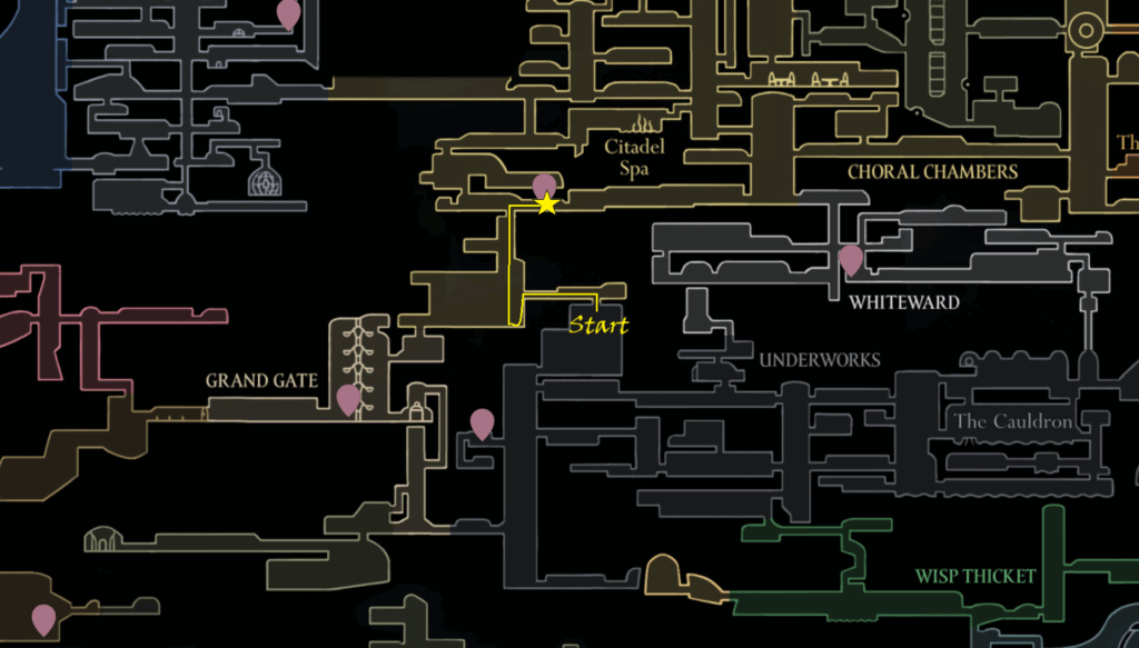 To begin our journey, start at the exit of the Underworks area, which leads into the Choral Chambers. Refer to the map for the exact location.