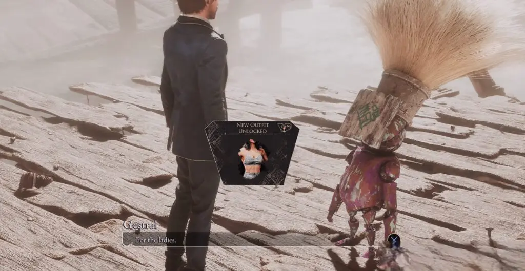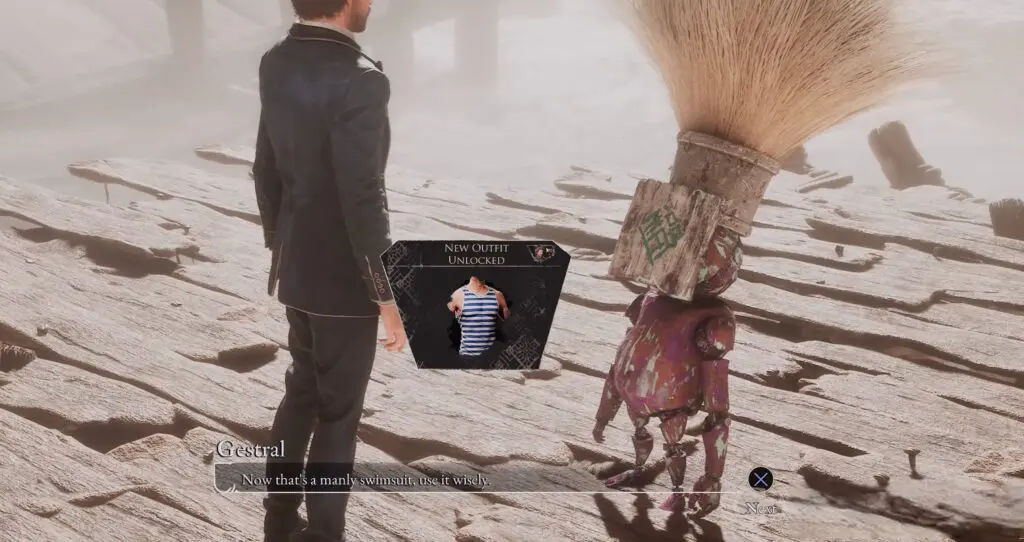 Keep talking to Gestral at the same location where you got Gustave’s swimsuit to unlock Lune’s Swimsuit I. This time, Gestral will give you a riddle before handing it over. After you get Gustave’s swimsuit, he’ll ask: “If I were 2 years old, at what age would I Gommage?” Answer correctly to receive Lune’s swimsuit.