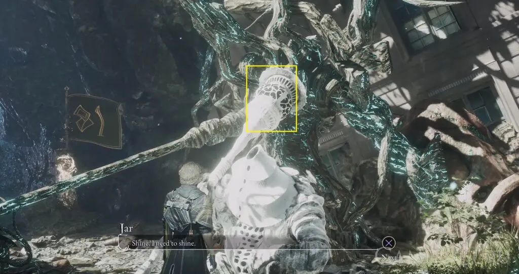 Speak with Jar near the Abandoned Expedition Camp Rest Point, then shoot the tip of the staff.