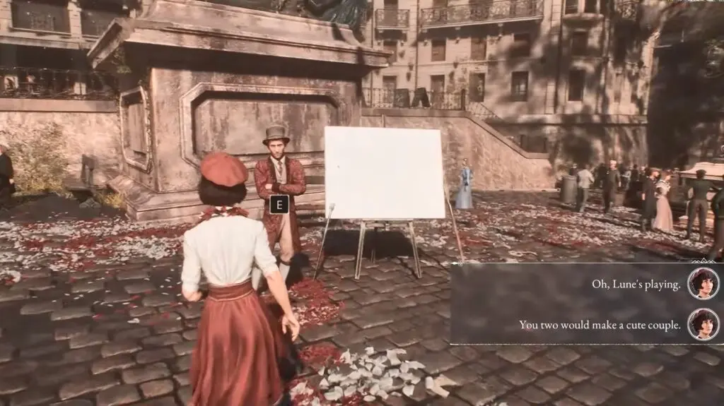 To find Music Record #1 in Clair Obscur: Expedition 33, start at the horse statue near Nicolas and walk to the right. Keep going past all the vendor stalls until you see a stage with performers. Look to the right side of the stage, deep in a dark corner. There, you’ll find a creepy mime standing alone. Go up to the mime, talk to it, and defeat it in battle to collect Music Record #1