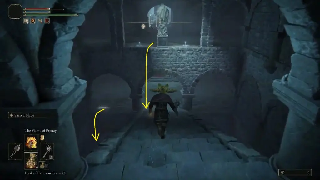 Climb another set of stairs and proceed straight ahead. Here you will have another trap in the path, so be cautious. Continue ahead and you will reach a room with a corpse inside, with a Scythe on it as shown below. Entering the room will trigger a trap that will fire three sets of arrows. Use a shield or dodge the arrows quickly. Then collect the Scythe.