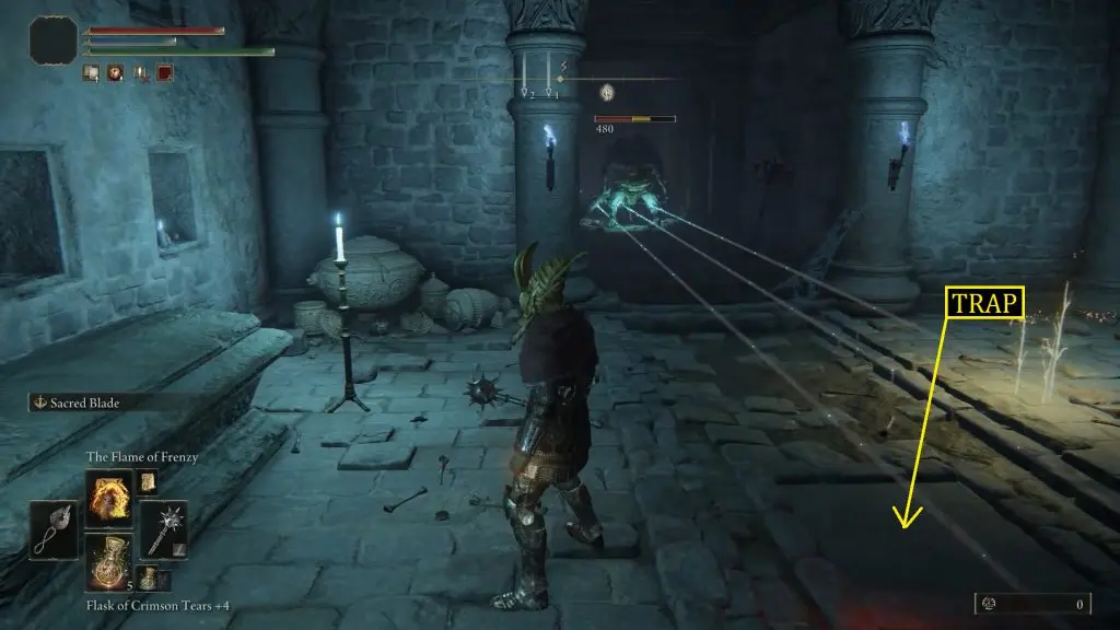 After jumping down, take the passageway on the right side. In the next room, you will find a trap. You can use the trap to kill the giant coming from the opposite passageway as shown in the picture below.