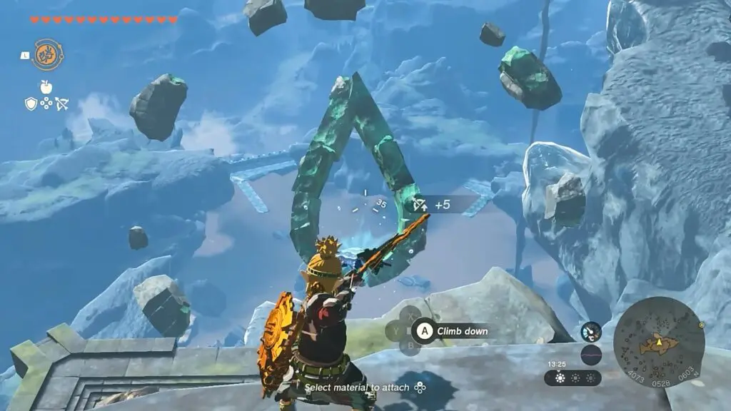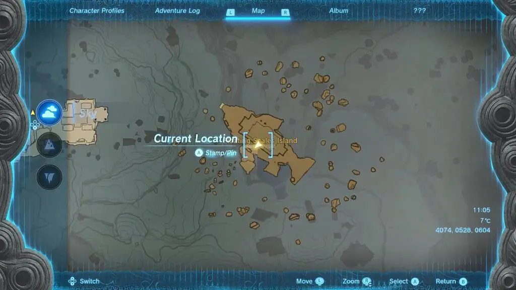Now go to the center of Floating Scales Island and look west (See the picture above for the exact location). You will see stones forming a shape of a droplet as shown in the picture below. Aim your arrow and attach King’s Scale to it. Now shoot the arrow through the droplet to complete the quest.